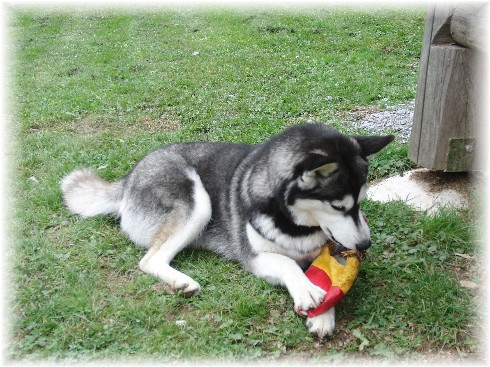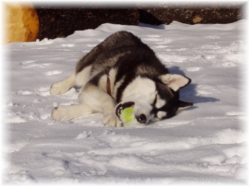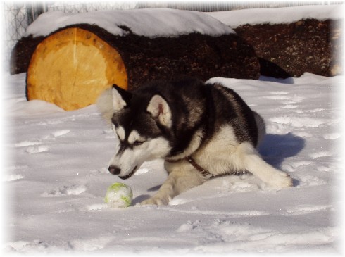 Arctica liebt Tennisbälle und wenn`s sein muß , spielt sie auch alleine damit . Sie wirft mit der Schnauze die Bälle hoch und fängt sie wieder .