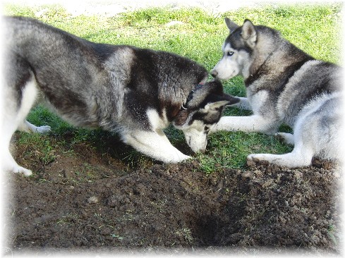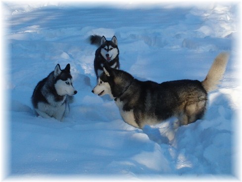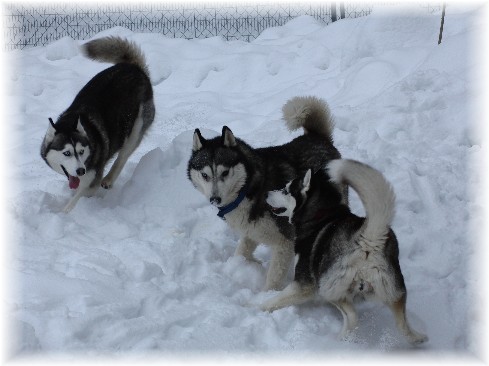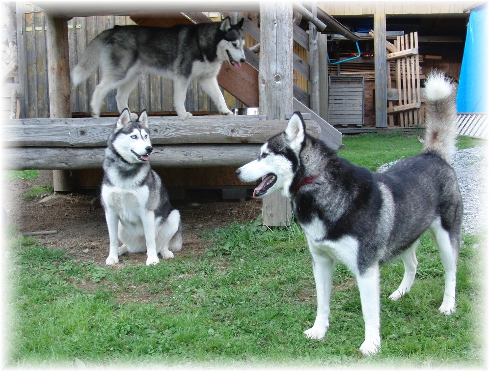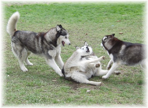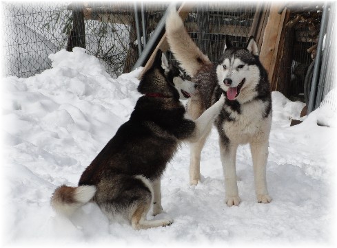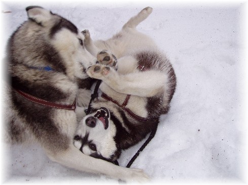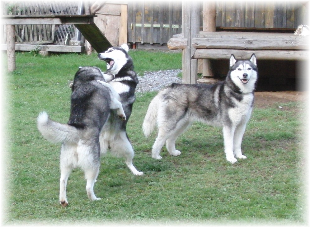 Und das Scherzen und Rumbalgen macht uns Huskies ganz viel Spaß , auch wenn`s für Fremde manchmal gefährlich aussieht .