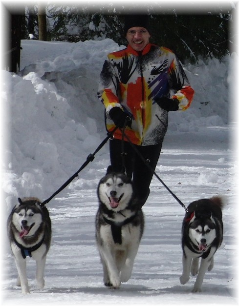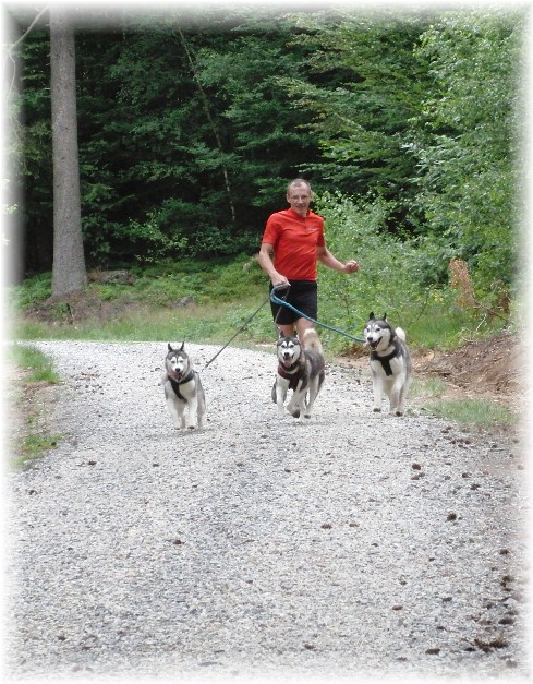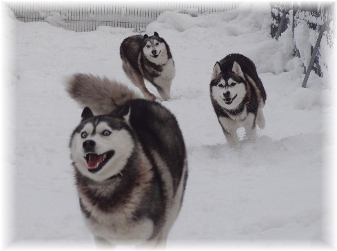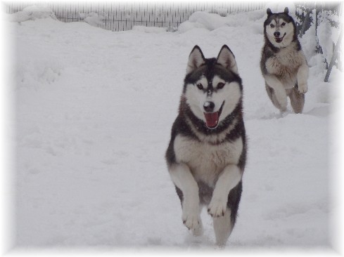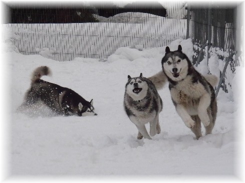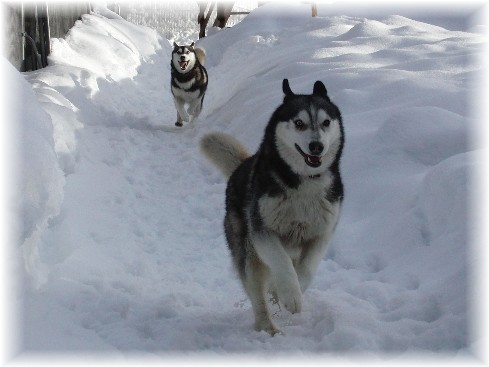 Laufen können wir Huskies natürlich auch , das ist unsere größte Leidenschaft . Klaus läuft mit uns oft stundenlang in den Wäldern über Berg und Tal . Am schönsten ist es im Winter , wenn überall Schnee liegt und es schön kalt ist . Und hier gibt`s im Winter immer viel Schnee , einfach ideal für uns Huskies .