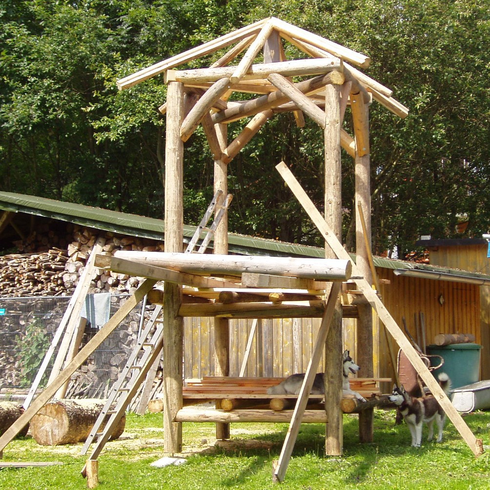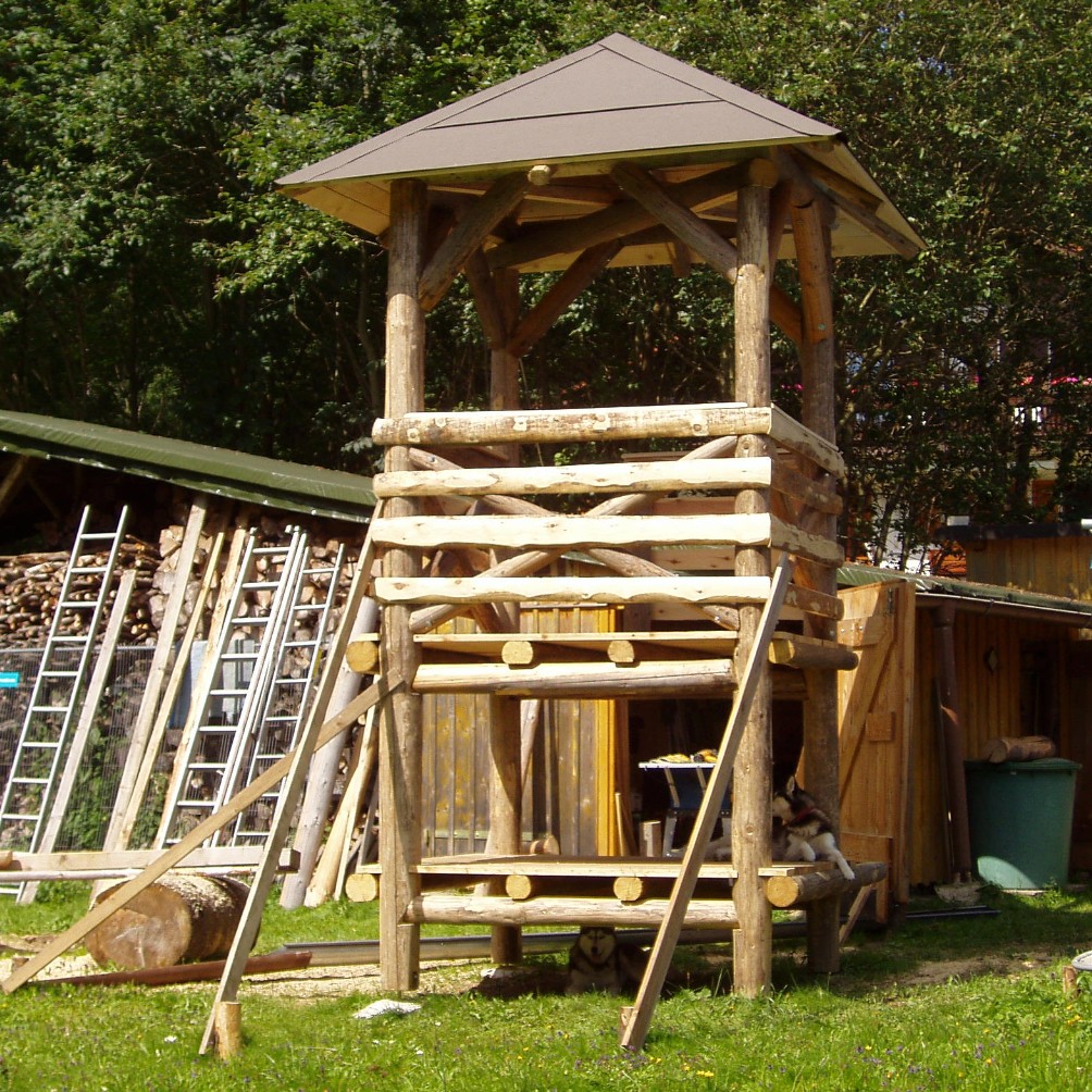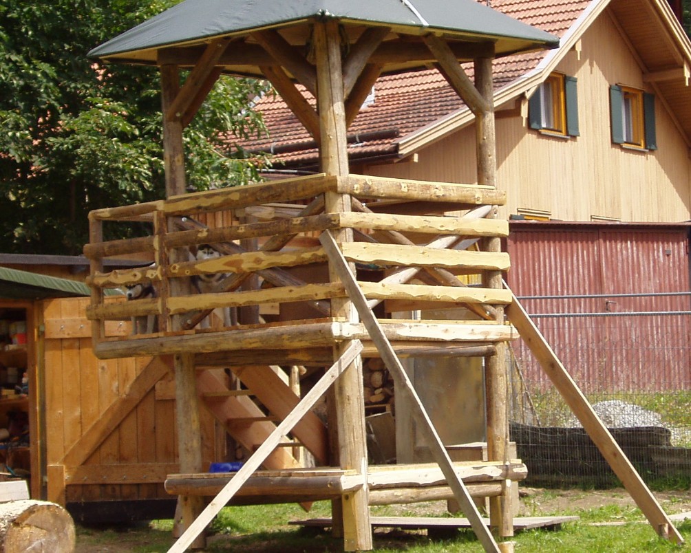 Jawohl , jetzt können wir über die Treppe nach oben , das müssen wir uns gleich mal anschauen . Ja , hier oben kann man die Umgebung sehr gut überblicken und kontrollieren . Das haben unsere Menschen ganz fein gemacht . Ein Dach hat unser Turm auch , damit wir nicht naß werden , wenn`s regnet .
